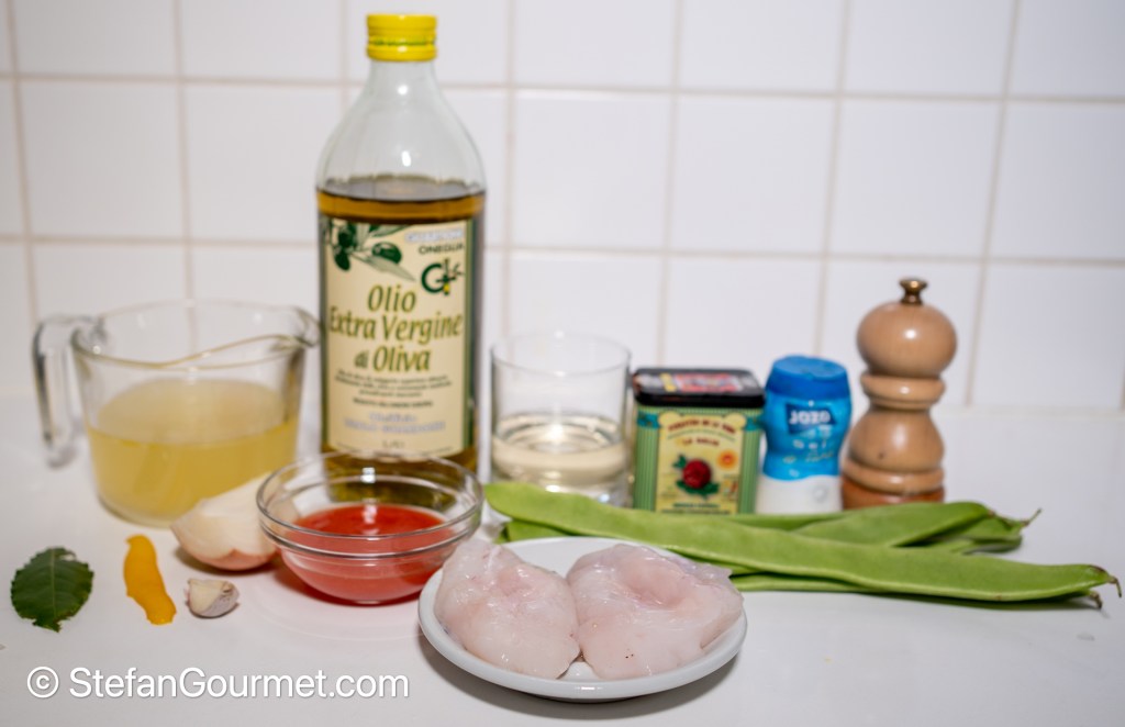 …but also with white wine. The Portuguese flavors (lemon rind, bay leaf, garlic, paprika) work just as well with the monkfish as they did with the pork cheeks. You could omit the tomato to keep the color ‘white’. The recipe remains the same otherwise. Unlike the pork cheeks, it doesn’t require long cooking. In fact, the monkfish is cooked very gently in the residual heat of the sauce for about 10 minutes only. This gentle cooking ensures that the fish will be tender and moist. The amounts in the recipe are for 4 servings, but the photos of the preparations are for a single portion.