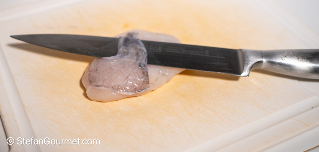 If your fish monger hasn’t done so already, remove the membrane from the monkfish.