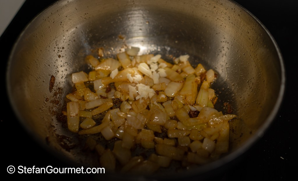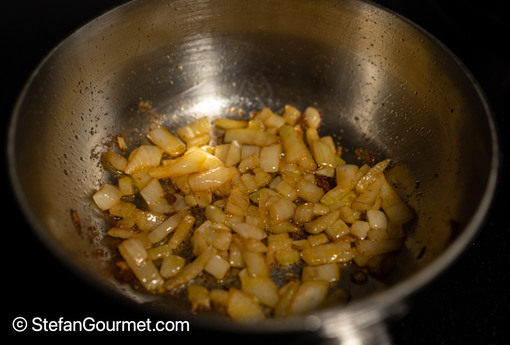 Add the chopped onion to the same pan with residual olive oil. Stir the onions over medium heat until they are soft and fragrant, about 10 minutes.