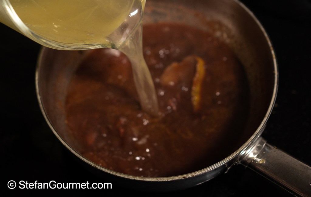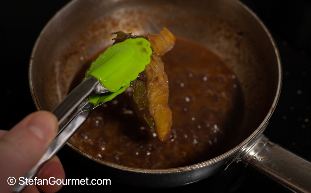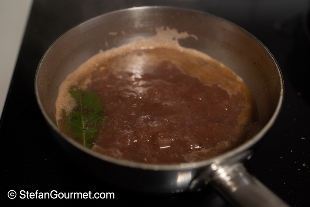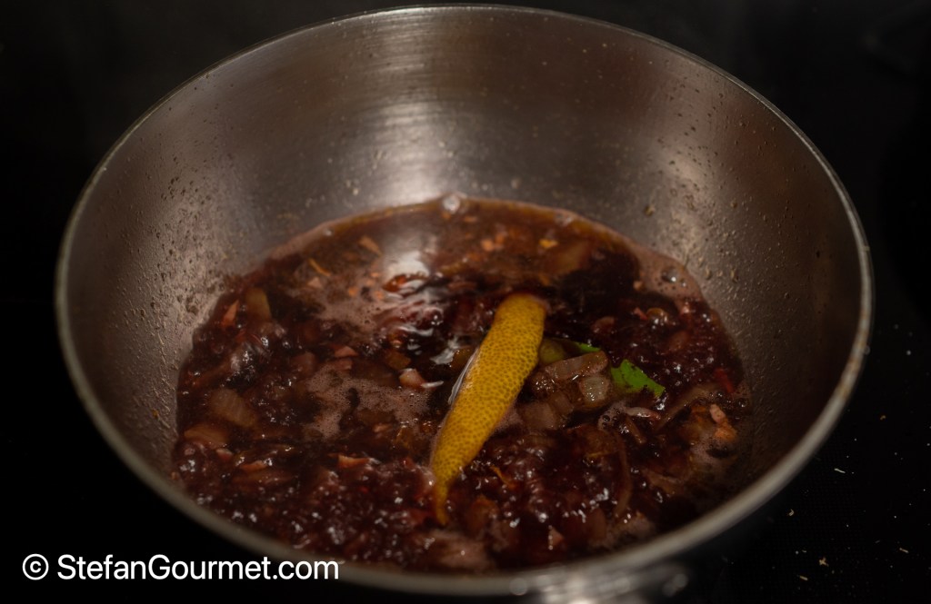 If the sauce has been reduced sufficiently, remove the bay leaf and lemon rind.