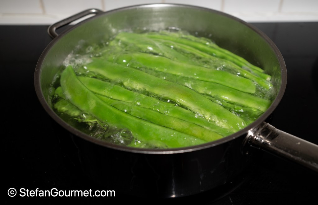 Meanwhile, remove the ends of the runner beans, and boil them in salted water with a bit of baking soda for 10 minutes. Drain at the end of the cooking.