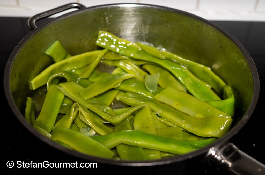 Meanwhile, reheat the runner beans gently with a generous amount of good quality extra virgin olive oil.