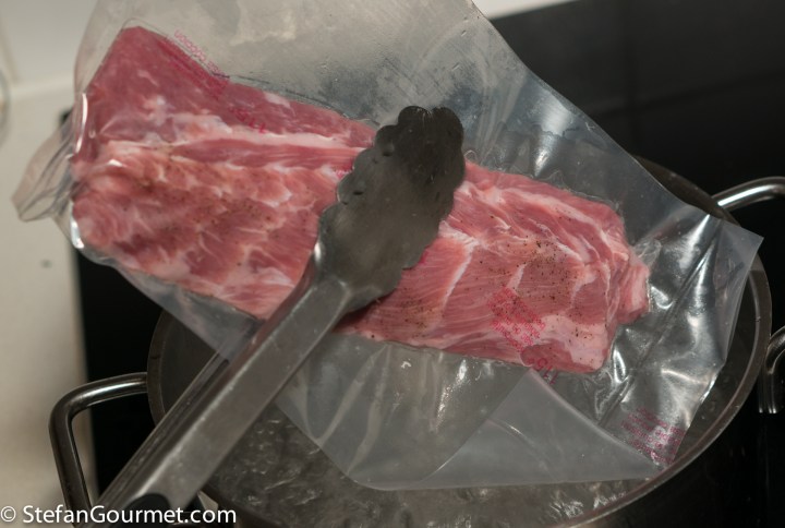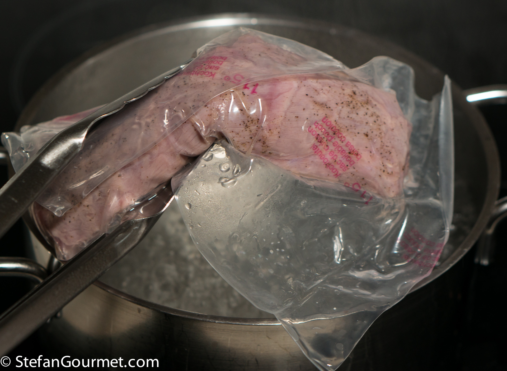 Season the lamb with salt and freshly ground black pepper, then vacuum seal. To prevent an unpleasant smell, it is important to scald the lamb for 10 to 20 seconds in hot or boiling water (at least 75C/180F).