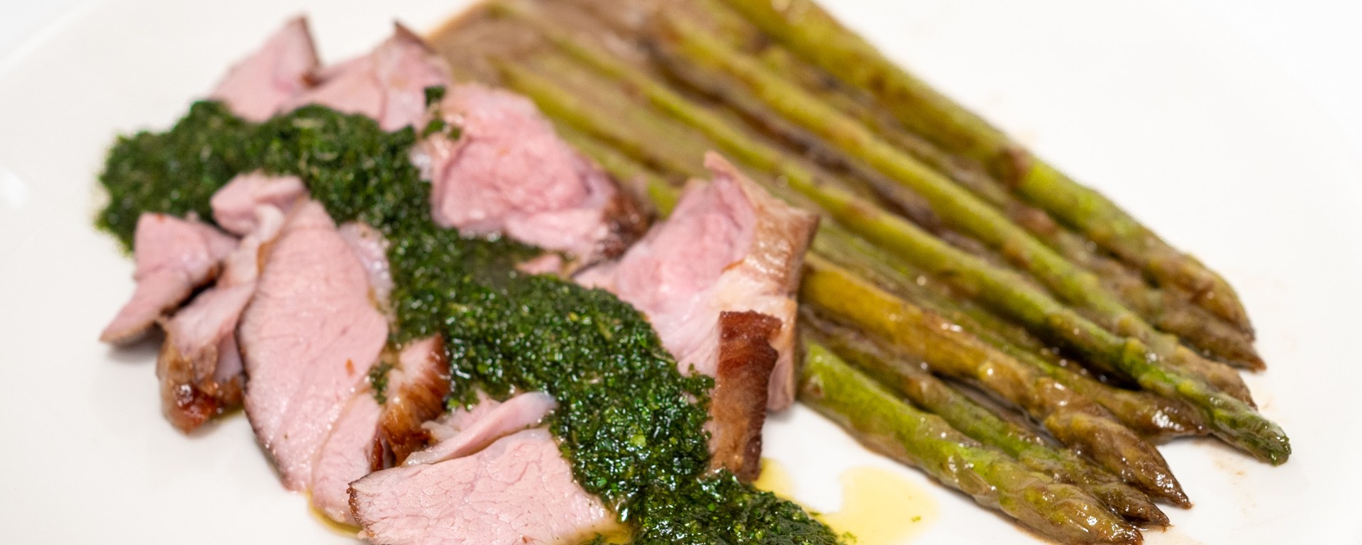 Due to the pandemic I can’t visit wineries, but thankfully sometimes a winery sends over some samples. I will write more about the wines of Bisci from Matelic from the Marche region in Italy in my next post. Their 2017 Rosso is a blend of 80% Merlot and 20% Sangiovese, and reminded me of a Merlot from Chile because it was fresh and fruity and smelled of mint. Kees suggested to pair it with lamb and mint, and that turned out to be a perfect pairing. Neck of lamb, cooked for 24 hours at 57C/135F, is my favorite lamb, but you could prepare this with other cuts of lamb like leg of lamb or lamb cutlets, and cook the lamb in the oven (for the leg of lamb) or frying pan (for lamb cutlets). As I did not use the juices from the sous vide bag for the sauce, I decided to use them to serve green asparagus in fondant style. That turned out great as well.