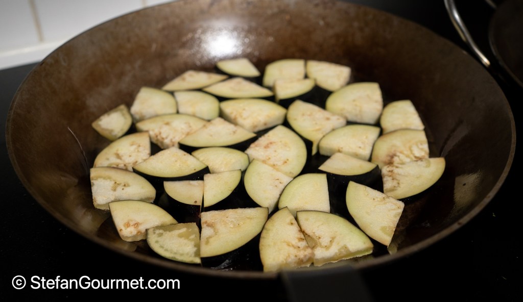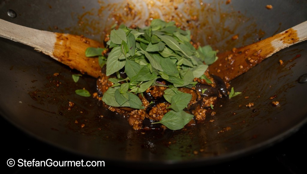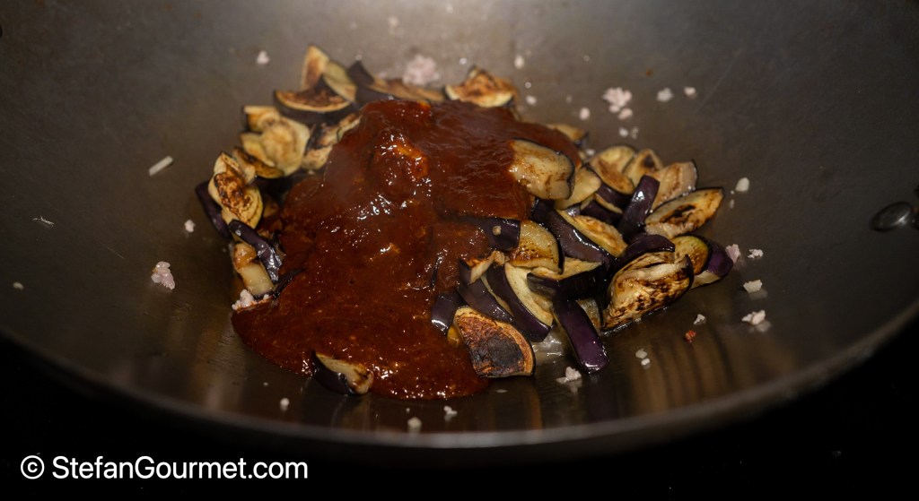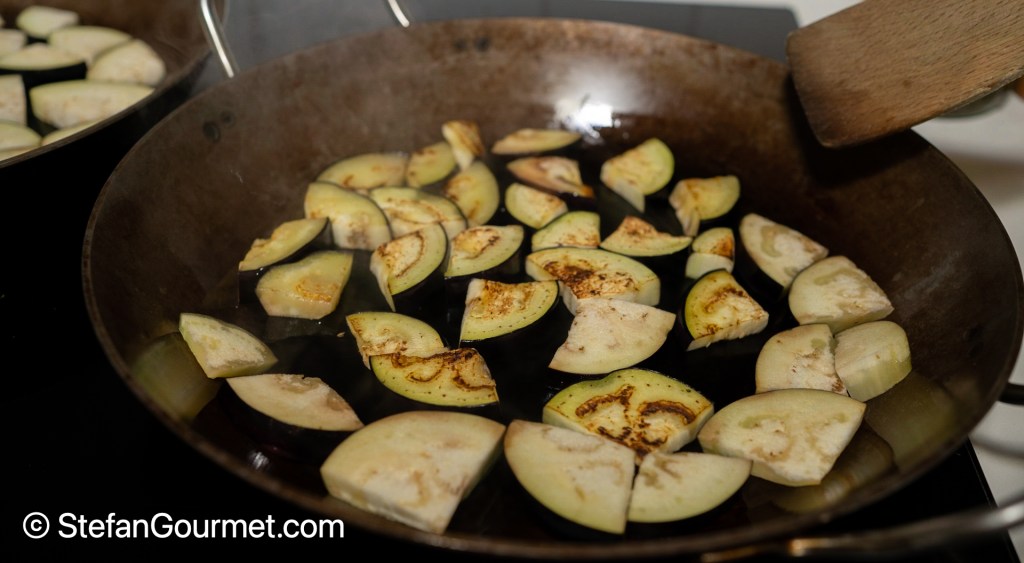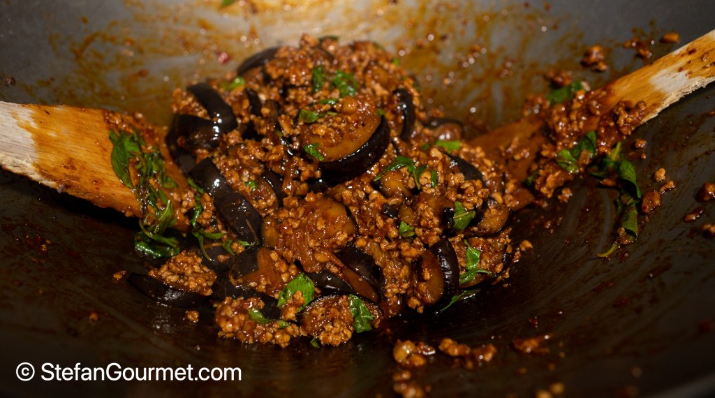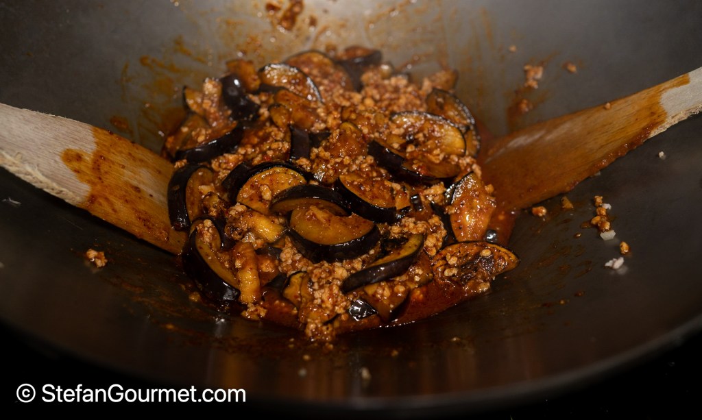 Stir fry until everything is well mixed and the eggplant is cooked. Then turn off the heat.