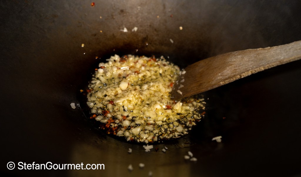 Add the minced garlic and stir briefly, but do not let the garlic turn brown.