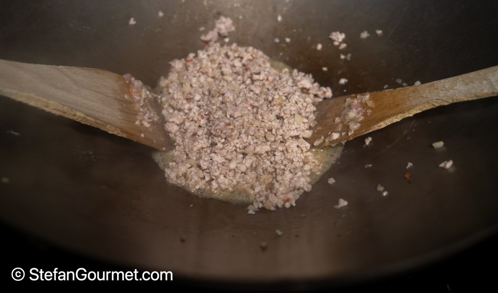 Stir fry until the raw pink color has disappeared. (Add a few drops of water if needed.)