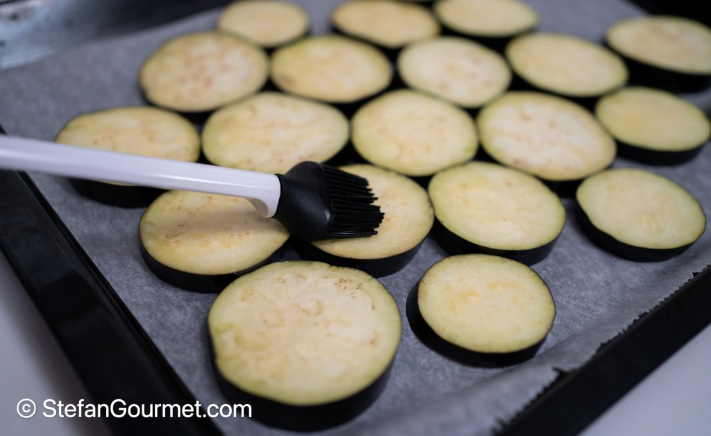 Roast the eggplant for 15 minutes at 225C/440F, then turn the slices…