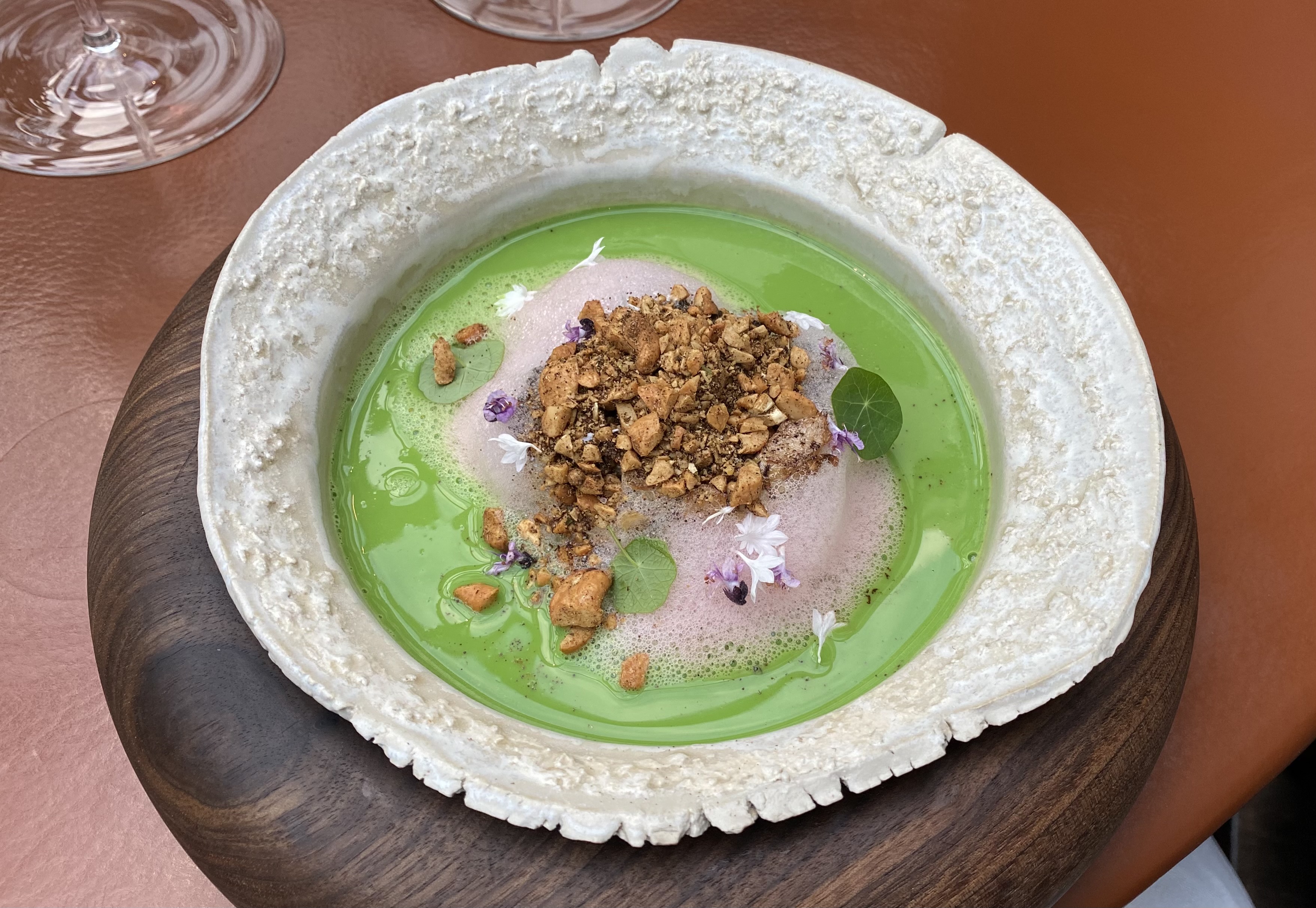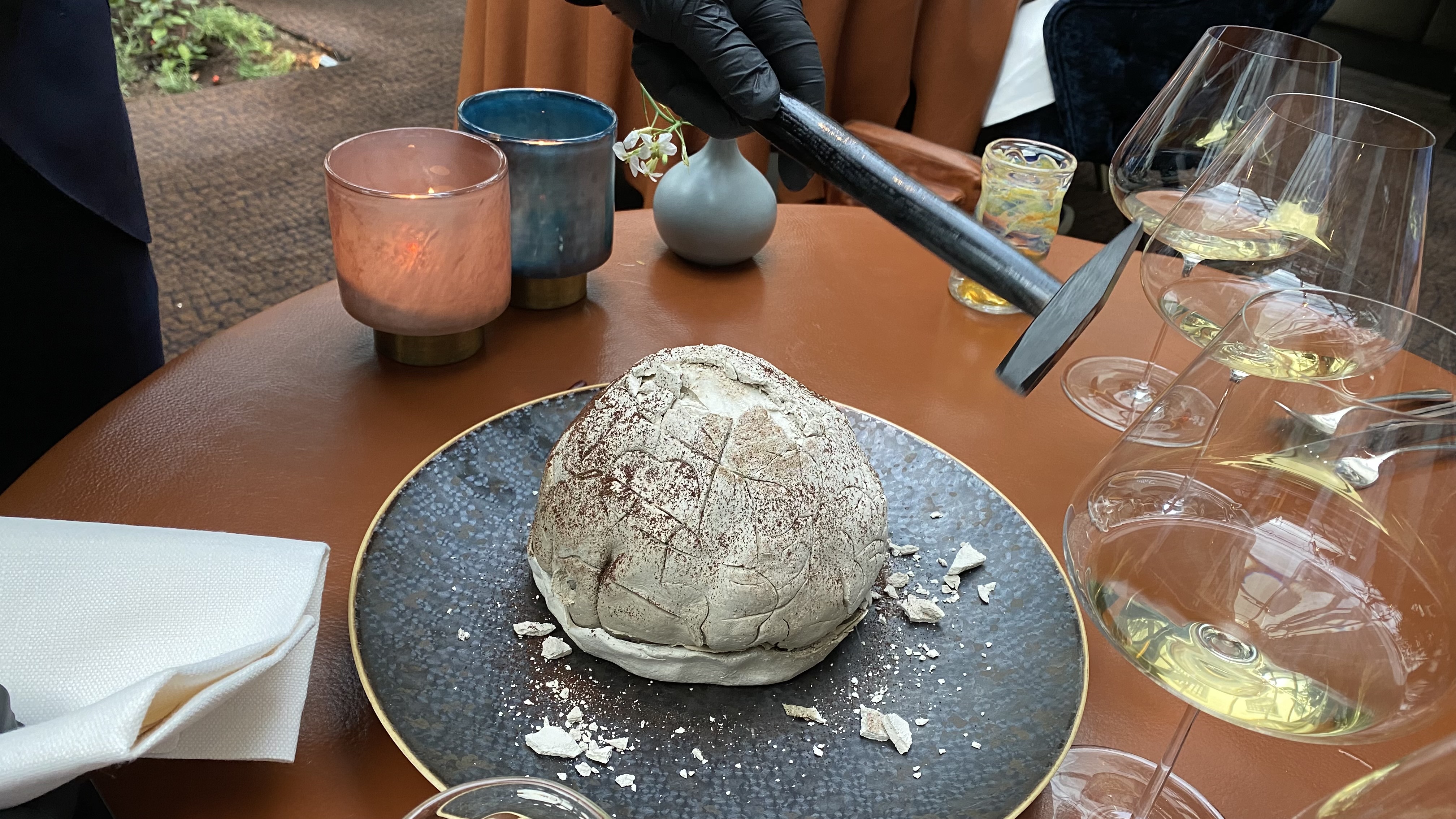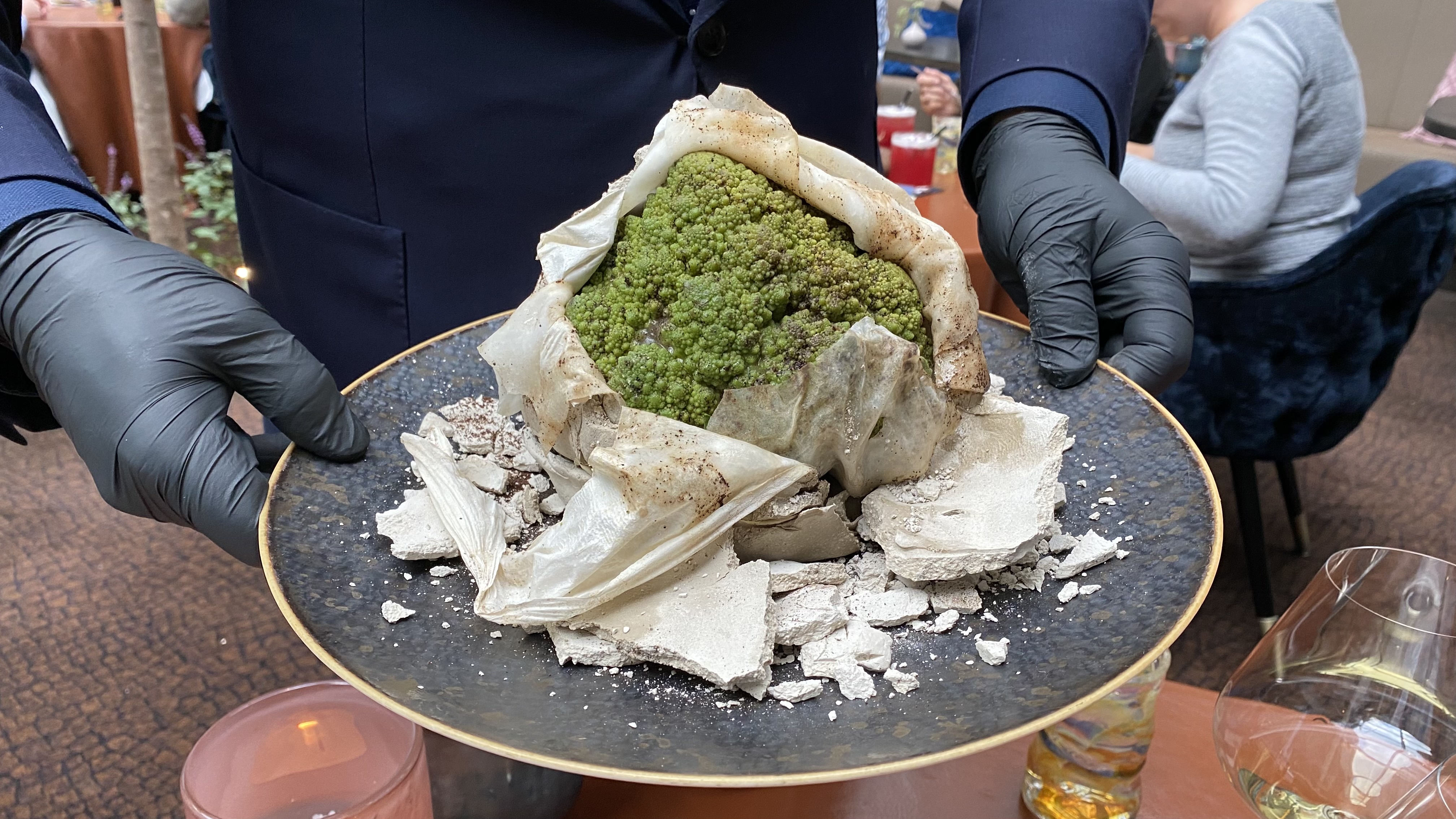 The chef was trying out a new dish, and we got to taste it. A green romanesco cauliflower has been wrapped in river clay and baked in the oven.