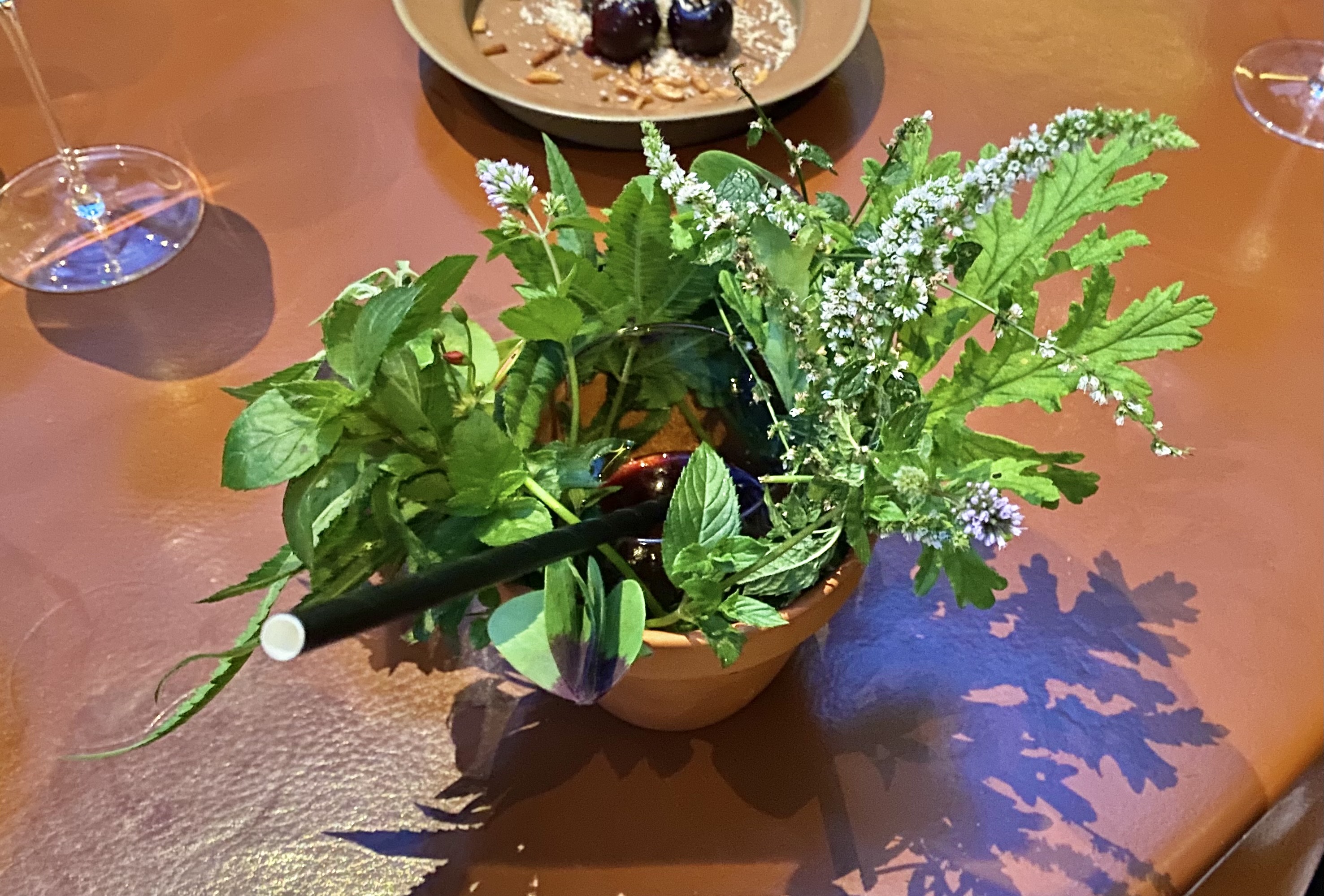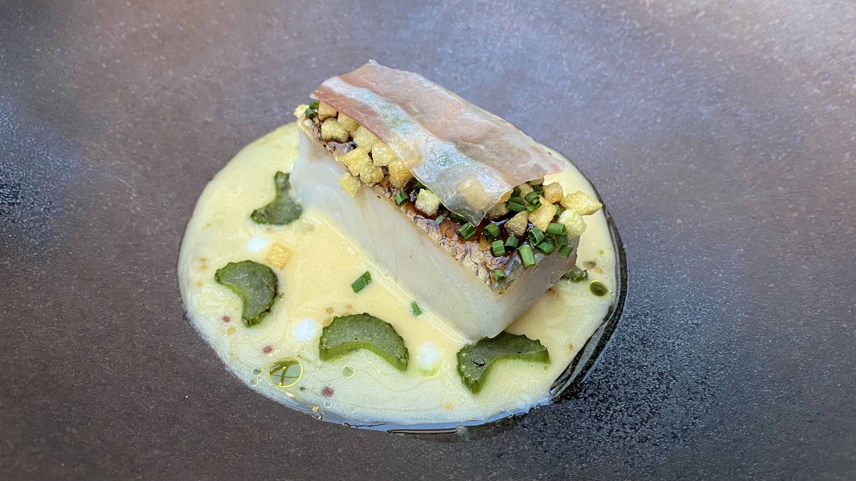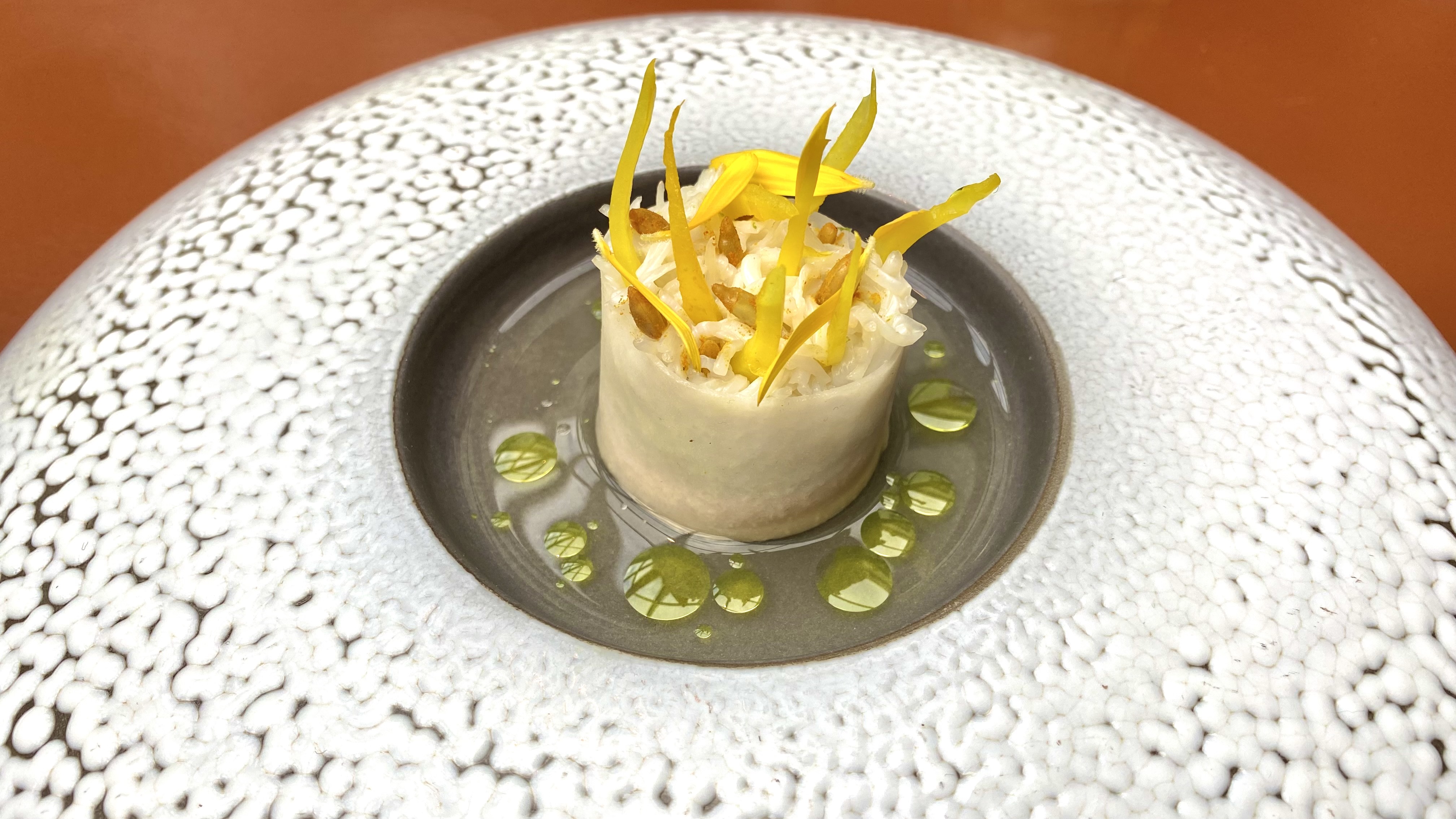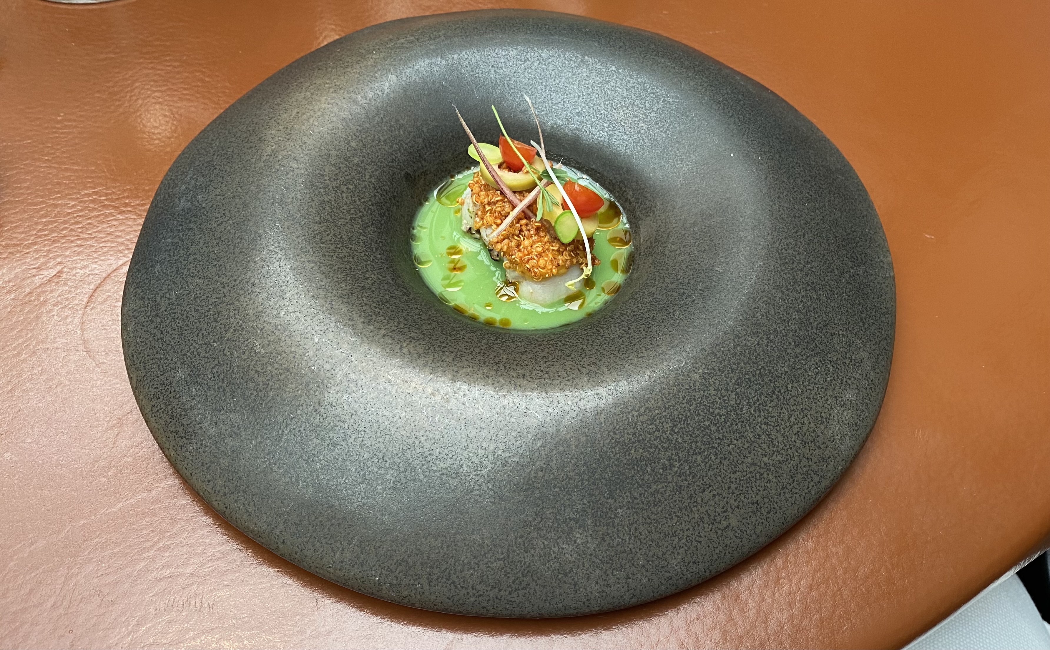 The chef was trying out a new dish, and we got to taste it. A green romanesco cauliflower has been wrapped in river clay and baked in the oven.