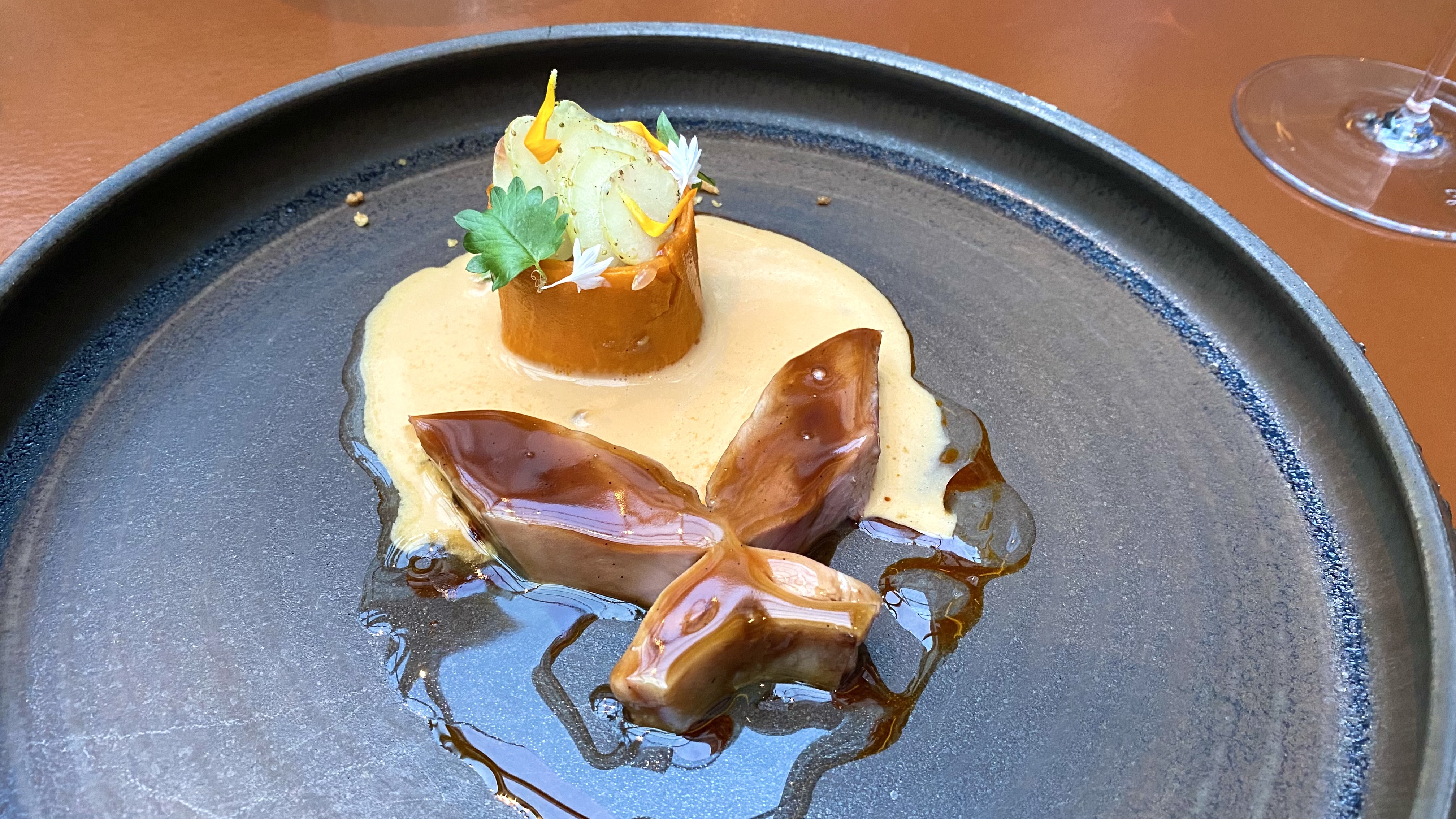 A T-bone of duck with a creamy fermented bell pepper sauce and unripe strawberry. This was nice, although not as nice as the duck T-bone with orange and chocolate from 2018. 9/10