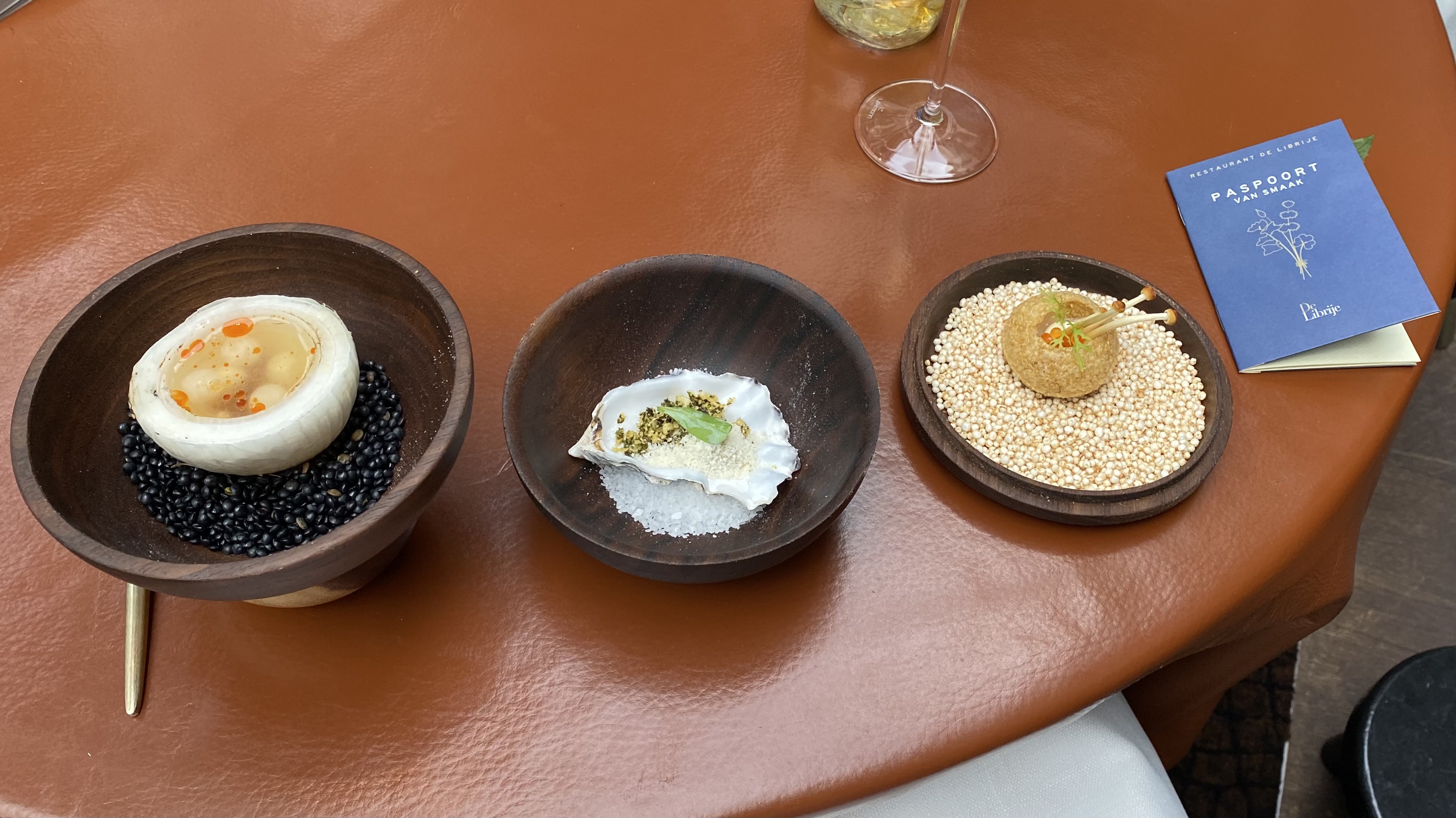 The second set of amuse bouche was a celebration of the produce from three of the long-time suppliers of Librije: trout with mushrooms from Delisalm, an oyster from the Oesterij, and fermented vegetable juice from Kwekerij Eef Stel. It was presented with a ‘passport of flavor’…