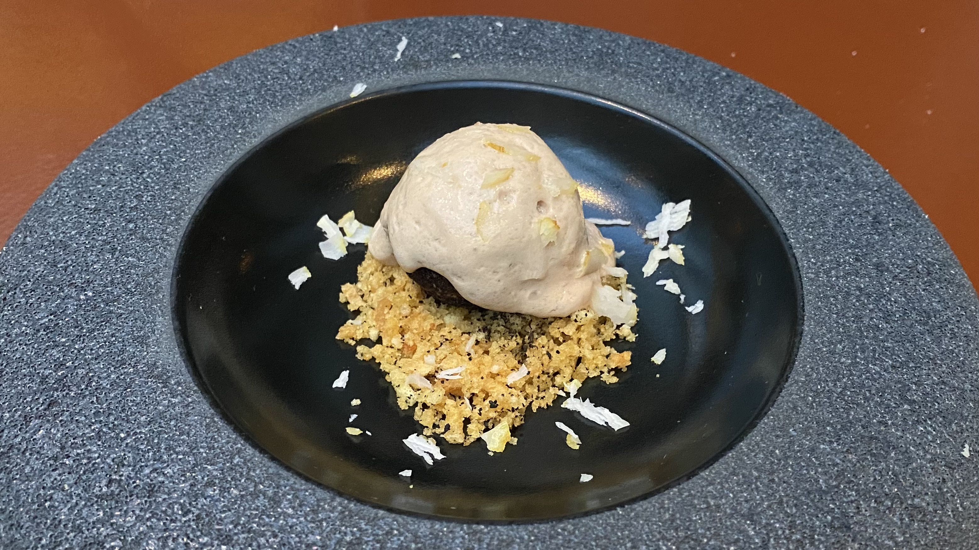 This was paired with a Coonawarra Cabernet Sauvignon from the famous “terra rossa” terroir. The wine itself was great, very smooth for a Cabernet, but we thought it overpowered the dish. This wine would be perfect for duck breast that was seared and served medium rare, but not for this dish. It didn’t clash and I can see why people who care more about blockbuster red wines than pairings would prefer it, but for us it didn’t work. We pointed this out, and we immediately were offered two other options: a red from Galicia and an Etna Rosso. The Spanish red was a bit acidic with the dish, but the Etna worked very well. I believe that an oaked rosé from Bandol such as Château Romassan would have been an even better pairing, but as usual restaurants prefer to have at least one red wine in the pairing.