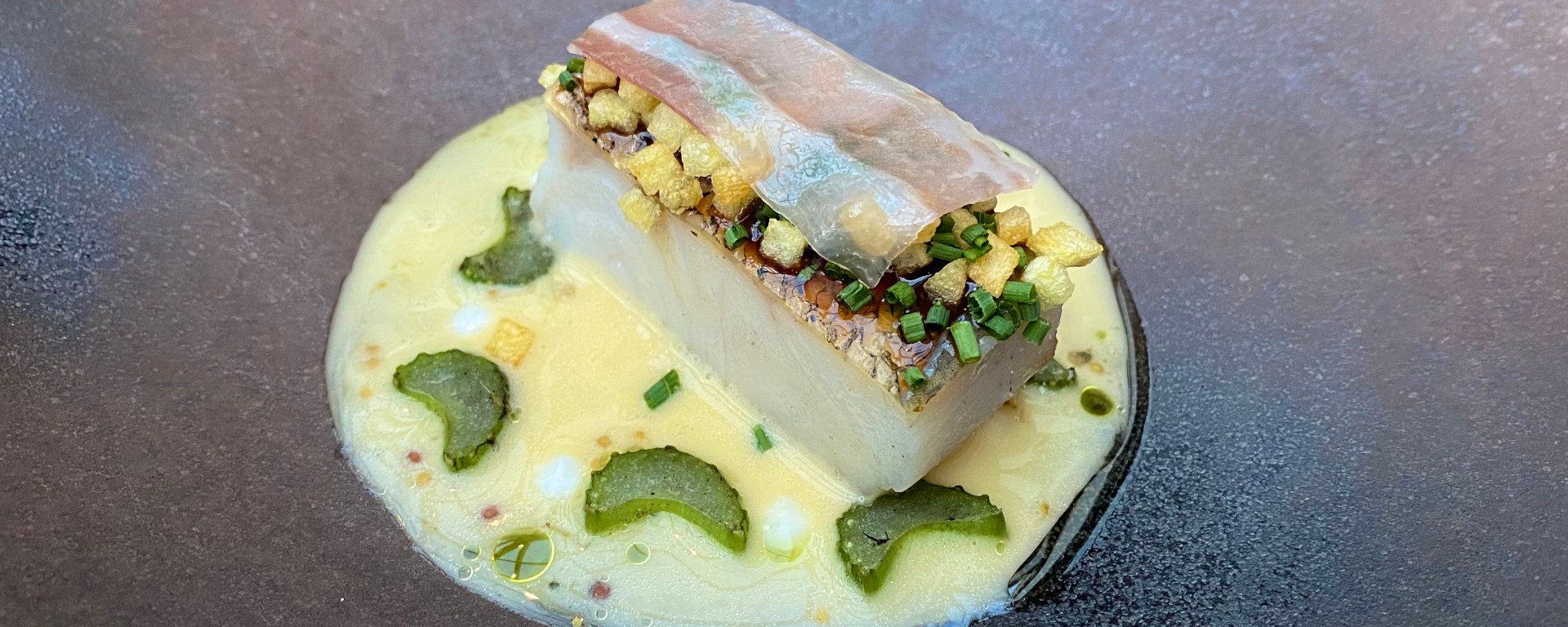 Next a historical dish that was on the menu when the chef had just taken over the restaurant back in 1993: steamed zander with tart apple syrup, bacon aged ‘in the attic’, crispy potato, chives, and celery. We also got this dish last year.