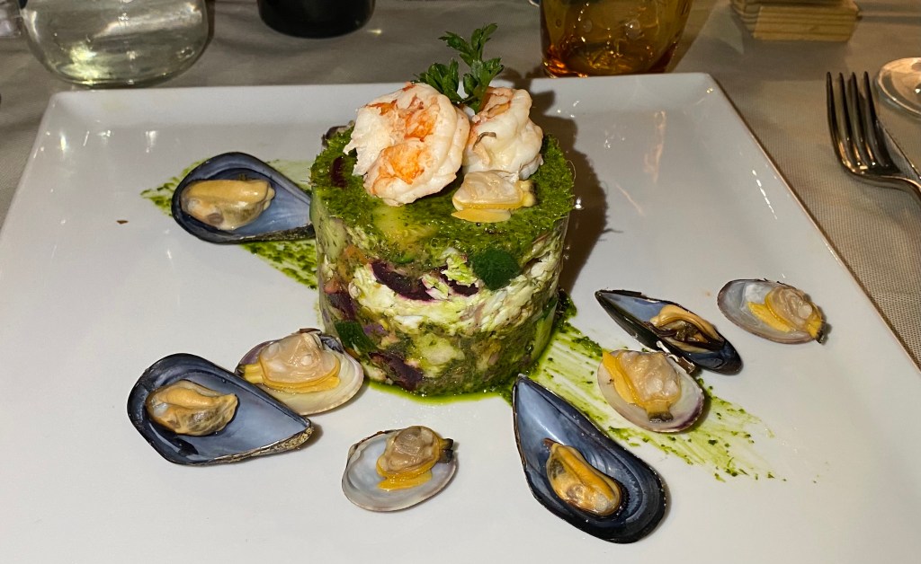 The next one was cappon magro. It is a typical Ligurian dish with layers of vegetables and poached sea bass with green sauce, shrimp, mussels, and vongole. The vegetables included carrot, cauliflower, and beetroot. I thought it was really nice, but a waste to boil the sea bass (as it dries out the fish). I am not awarding a prize for who can guess how I am going to prepare my version…