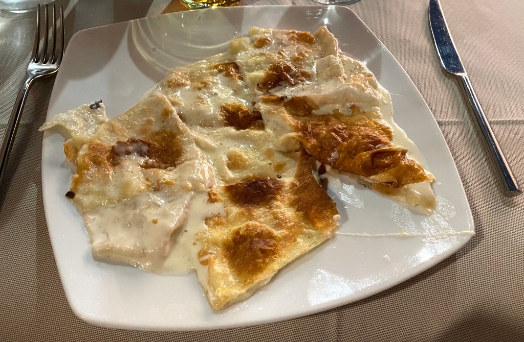 The first one was Focaccia con Formaggio di Recco. This originated from the small seaside village of Recco in Liguria. It is very thin focaccia, baked with fresh cheese. According to Paolo, Paola’s husband, the focaccia at Del Ponte was good, but not as soft as is it can be.