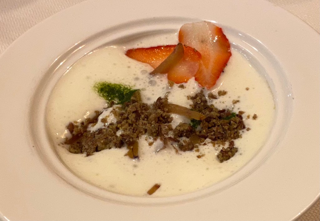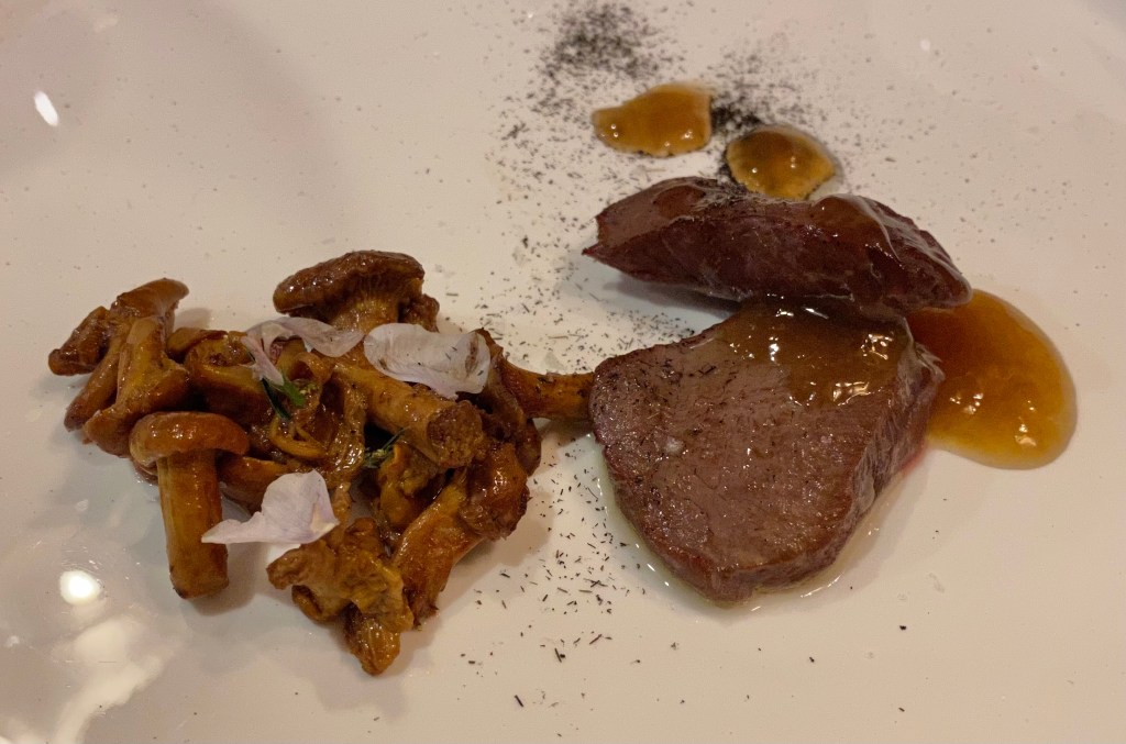 It was perhaps a bit too vibrant for the next dish of venison fillet with mushrooms (similar to chantarelles), hay ashes, and konbu. A wine with more tertiary aromas would have worked even better with this dish, although it was certainly not a bad pairing. The konbu and hay ashes did not have a lot of flavor and could have been omitted, but the venison and mushrooms were very nice. 8/10
