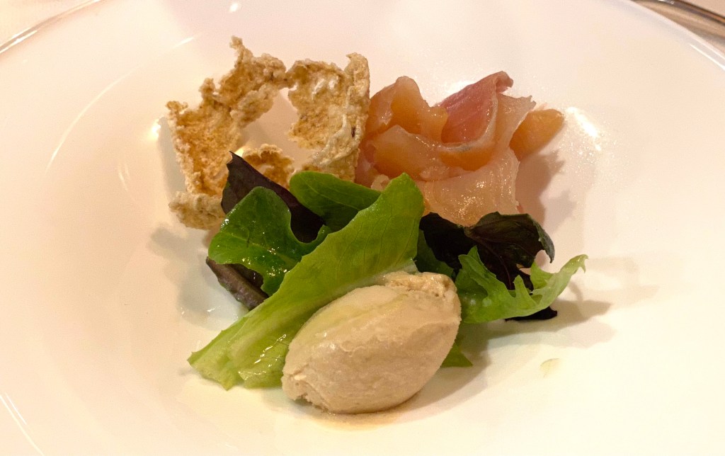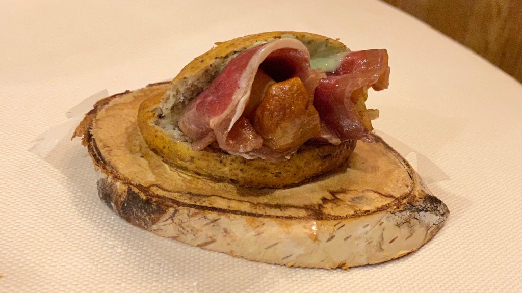 First course of Plissn: lightly marinated trout with vinegar ice cream, lettuce, orzo ‘krupuk’, sprayed with juniper aroma. The combination of textures, temperatures, and flavors was really nice. The vinegar ice cream tasted a lot better than you’d expect from the name. I could not really make out the juniper spray. The trout was mostly their for the texture and could have used a bit more salt. The pairing with the sparkling wine worked well. 8/10