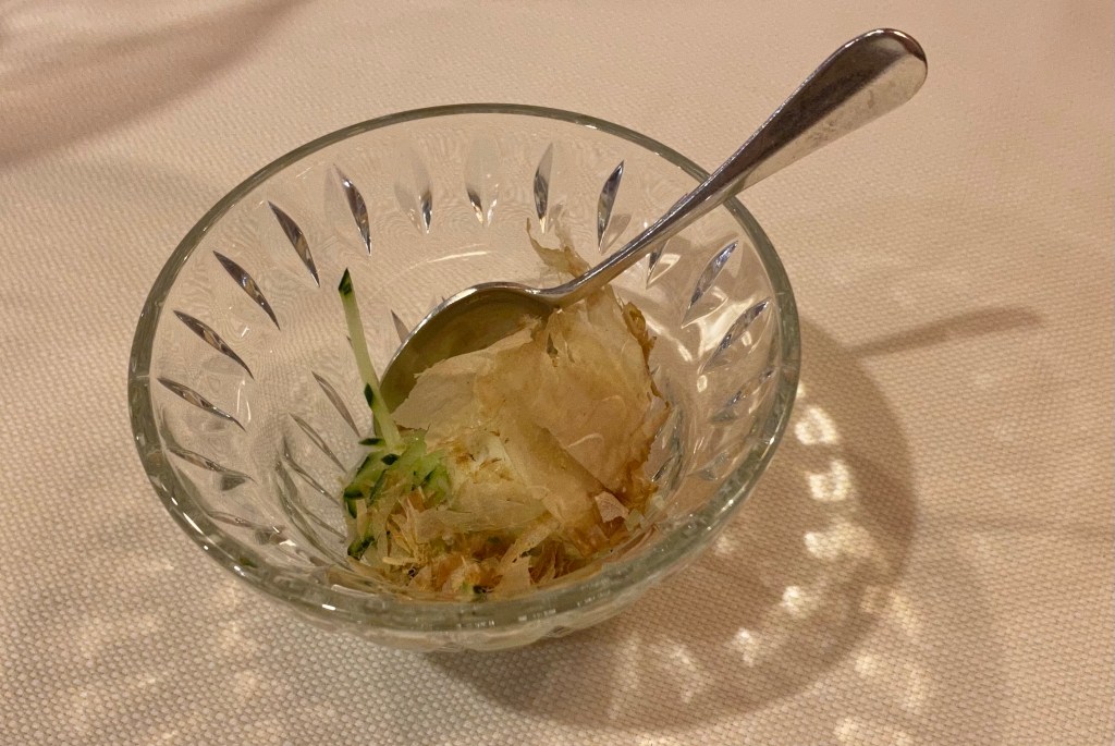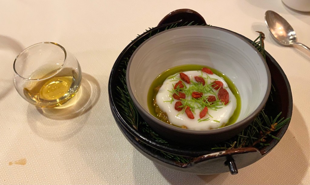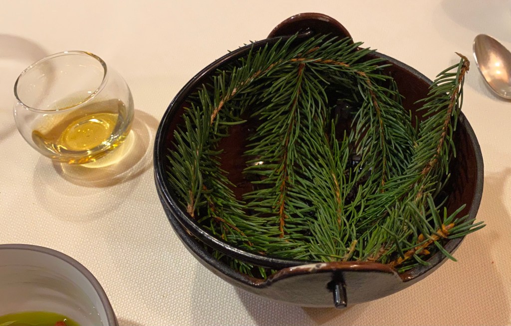 The spruce aroma was enhanced by the spruce under the bowl. A very unusual dish with vegetal flavors and aromas. 8/10