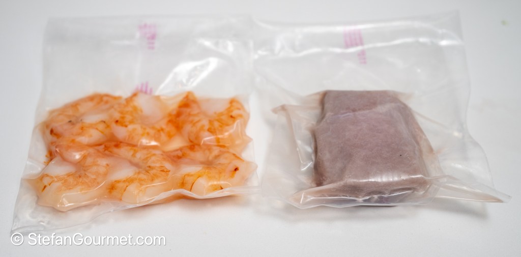 Season the shrimp and pork tenderloin with salt, and vacuum seal.