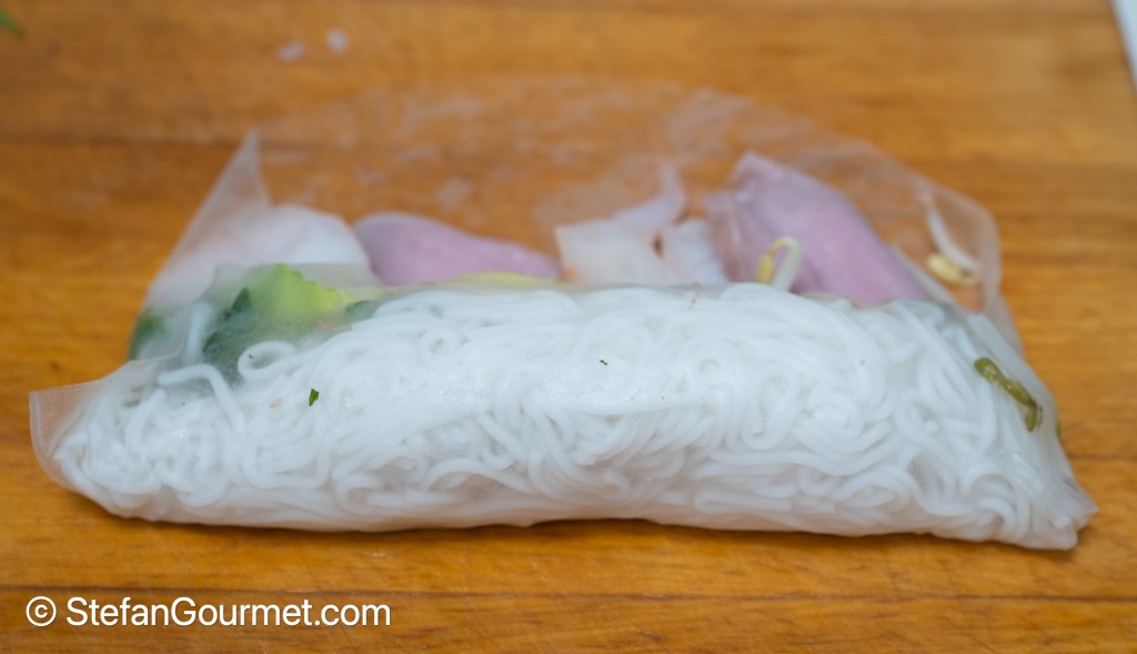 Now continue to roll up the rice paper tightly until the spring roll is closed.