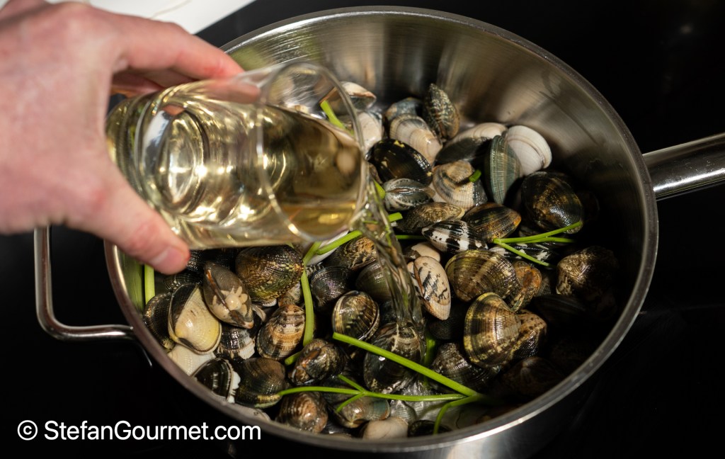 Put the vongole in a pan with 120 ml (1/2 cup) of the white wine. Add the stalks from the parsley, if you have them.