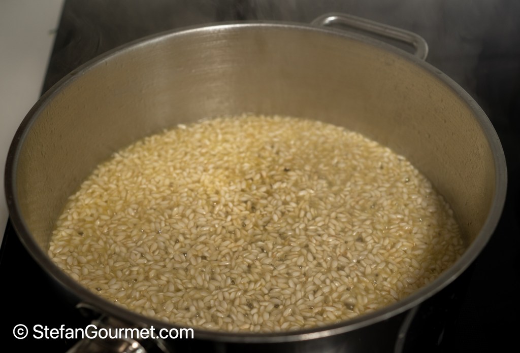 Add 200 grams of risotto rice, and toast it over medium-high heat for a couple of minutes.
