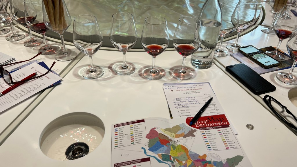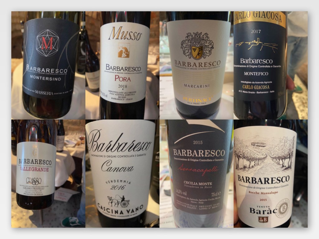 We tasted 8 different Barbareschi from 4 vintages (2018, 2017, 2016, 2015), different soil types (more clay or more sand), different altitudes, different expositions, different micro climates (closer or further away from the river) and different vinification methods (small or large barrels, new or used barrels, long or short skin maceration). Because of all those factors, it would require a lot of study to fully know and understand all different Barbareschi from the 66 different MGAs and an even larger number of producers. Generally speaking a Barbaresco from a sandy soil will be lighter than a Barbaresco from clay, but if the Barbaresco from sand is from a warmer vintage than the Barbaresco from clay or from a lower altitude or warmer exposition, it can actually have more tannins.