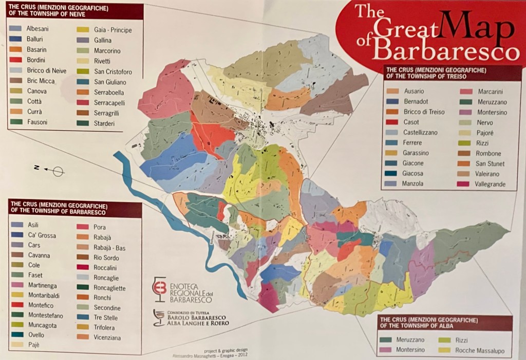 A recent development is the introduction of 66 Menzioni geografiche aggiuntive (MGA), which can be printed on the label of a wine is made only from grapes of that specific geographic area. These are sometimes called “cru”, but there is no official ranking between the different MGA.