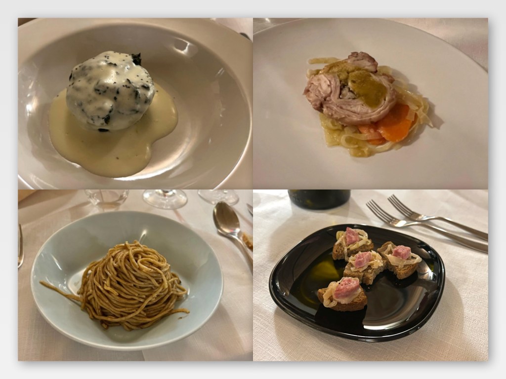 The food was also very good. We started with crostini with sancrau and cotechino, followed by with a spinach flan with robioloa (goat cheese), then tajarin al sugo d’arrosto (tajarin are fresh hand-cut egg noodles from Piemonte), roast rabbit with fennel and carrot, and bunet for dessert.