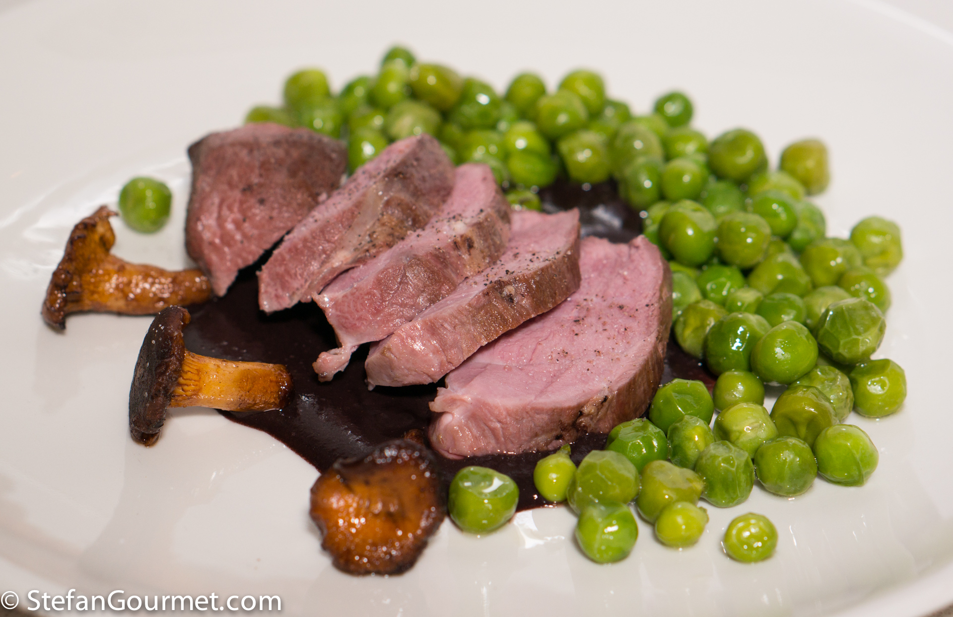 Sometimes the inspiration for a dish comes from a wine that I wanted to drink with it. This dish started with a 2004 Barbaresco that I knew would work well with duck breast and a red wine reduction. Barbaresco works well with earthy flavors, and I saw chanterelle mushrooms at the market. And so this dish of duck breast with a red wine reduction and chanterelle mushrooms was born.