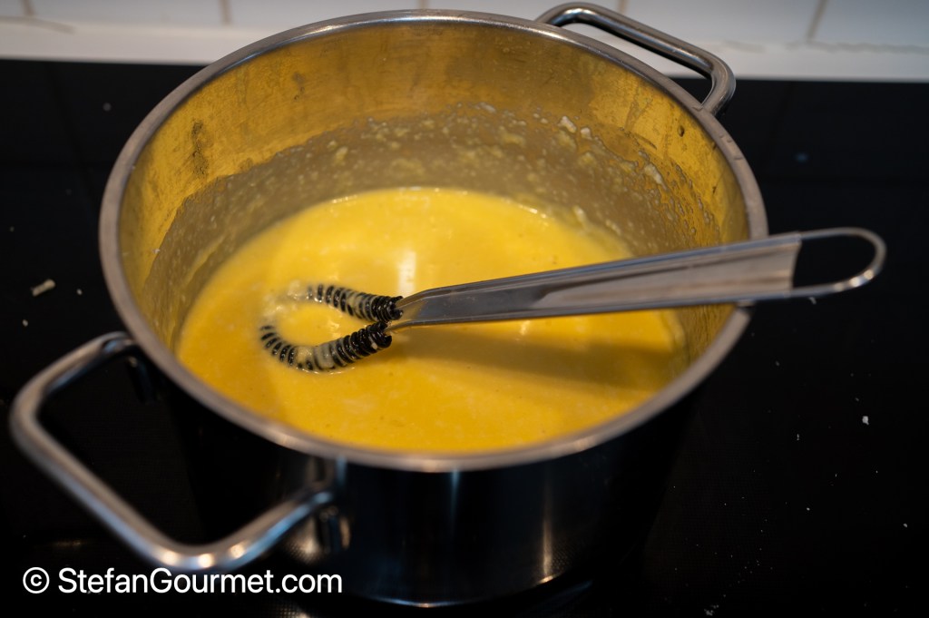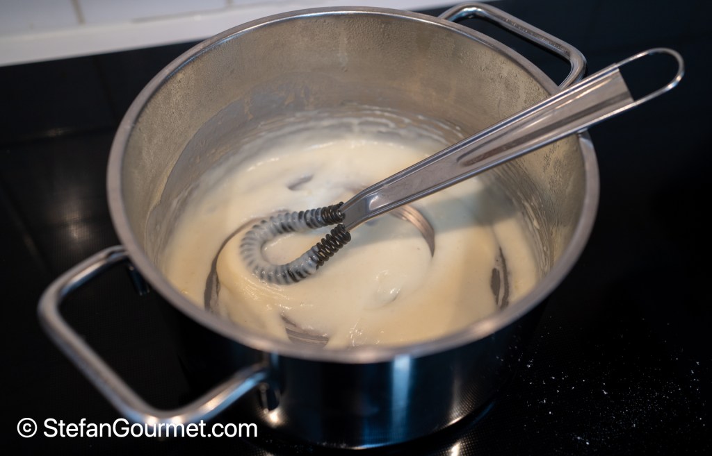 Start by making a besciamella (white sauce) using 160 ml milk, 20 grams butter, and 20 grams flour, using my instructions.