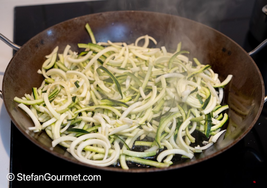 Heat 2 tablespoons of olive oil in a frying pan, and add the zucchini.