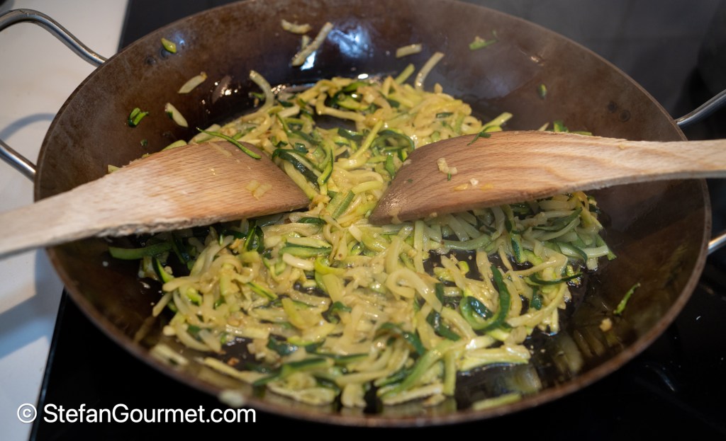 Stir fry the zucchini over high heat until it starts to turn golden, then turn off the heat.
