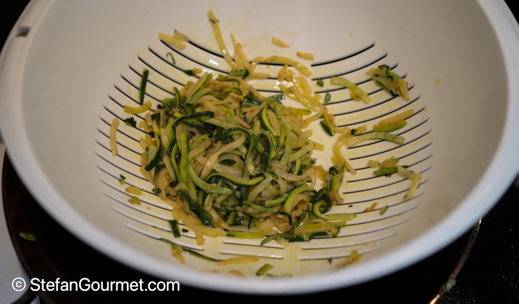 Drain the zucchini to get rid of excess liquid, then season with salt and allow the zucchini to cool somewhat.
