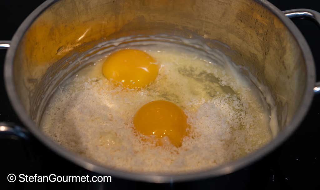 Add 4 eggs and 60 grams freshly grated parmigiano to the besciamella, which should have cooled off sufficiently by now to avoid cooking the eggs prematurely.