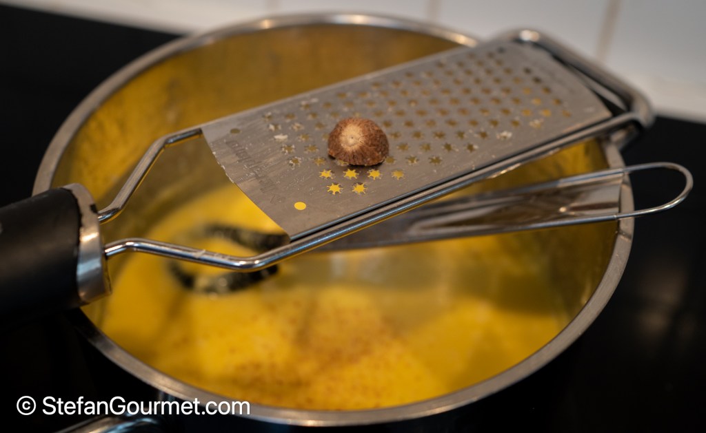 Add a dash of freshly grated nutmeg, and season with salt and freshly ground black pepper.