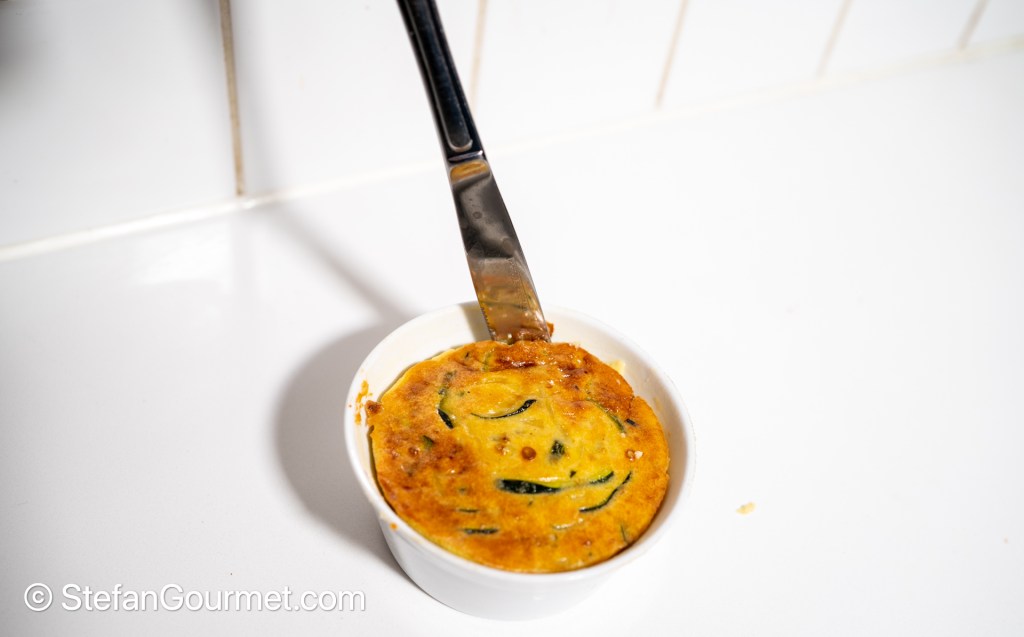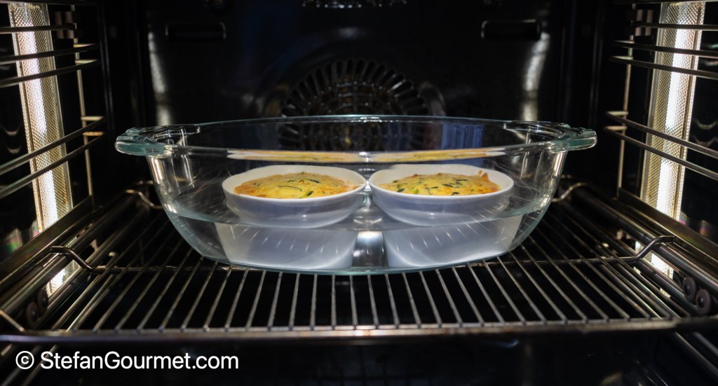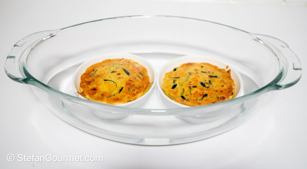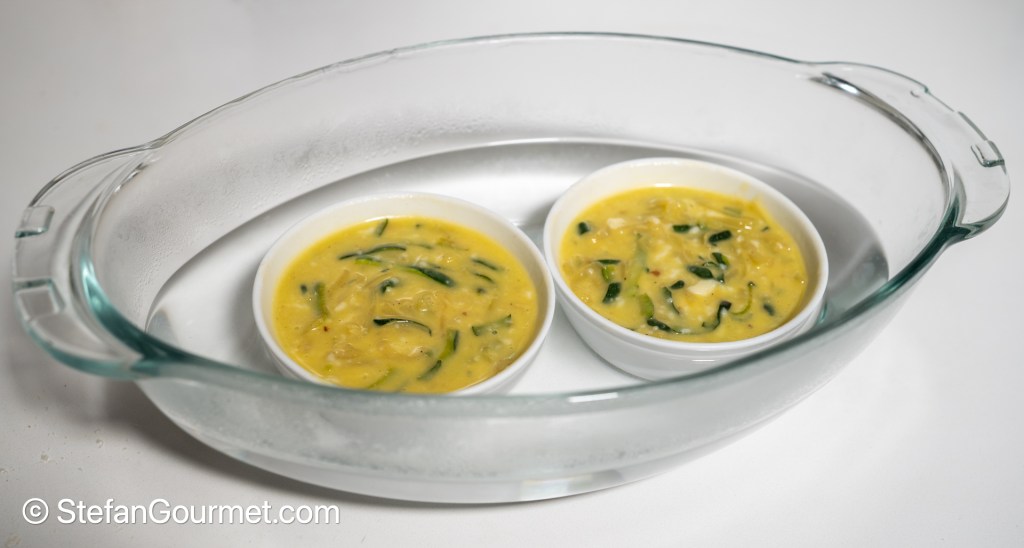 Ladle the zucchini mixture into the prepared ramekins, then place the ramekins in an oven dish that is filled with hot water such that the water level is about 1 cm (1/2 inch) beneath the rim of the ramekins.