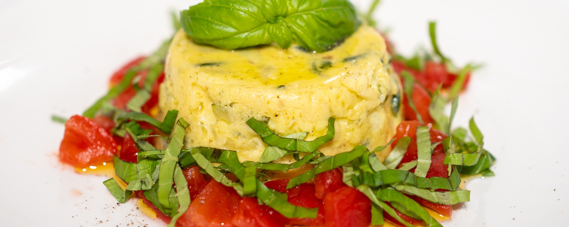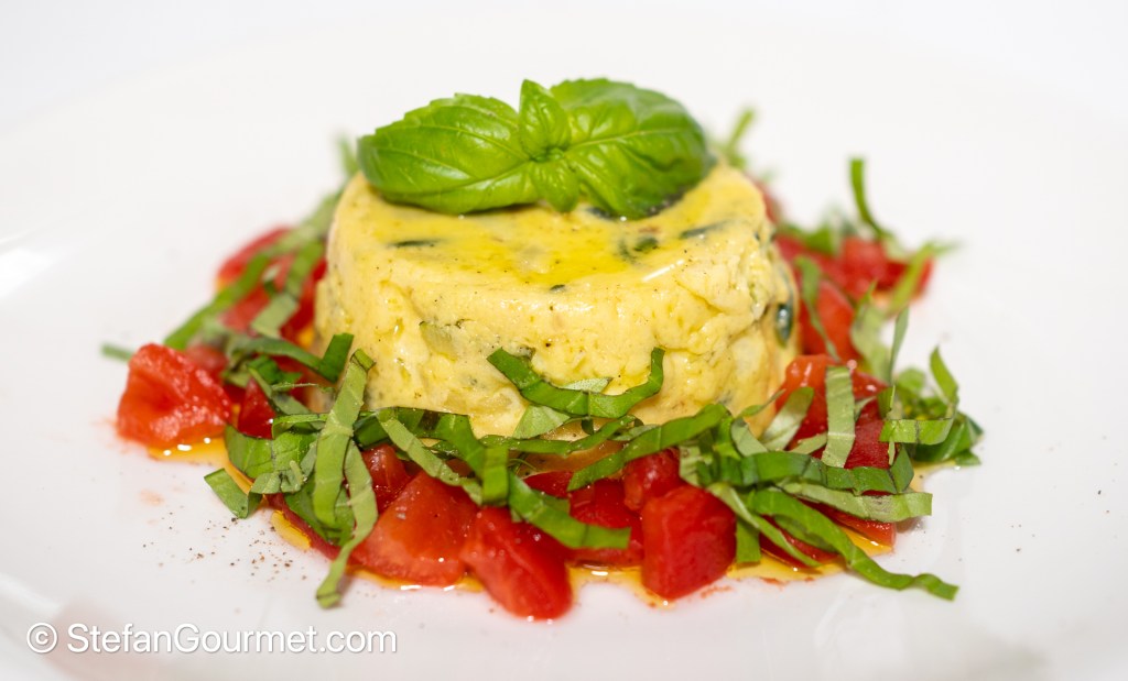 Flan di zucchine is a typical dish from Piemonte that we enjoyed at Due Lanterne in Nizza Monferrato. It is a savory flan (pudding) filled with zucchini and served with a lukewarm tomato salsa, basil, and extra virgin olive oil. This dish can also be prepared with other vegetables, and is generally called flan di verdure. To recreate this at home, I looked in “La cucina del Piemonte” by Giovanni Goria. His recipe does not provide any quantities, but advises to make the flan with besciamella, eggs, and parmigiano, and so that is what I did. I had to experiment a little to find the right quantities.