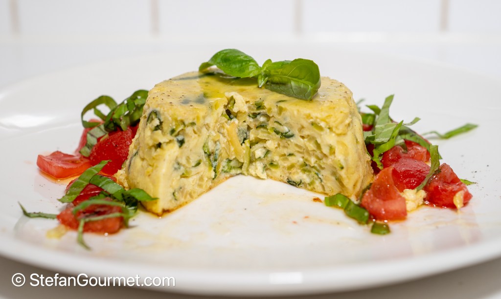 Although this dish is best prepared in summer when tomatoes and zucchini are at their best, if like me most zucchini and tomatoes you can find are coming from the greenhouse around the year anyway, you can make it in any season to bring a bit of summer to your table. It is very suitable for a dinner party, as it can be prepared completely in advance and can be served at room temperature.