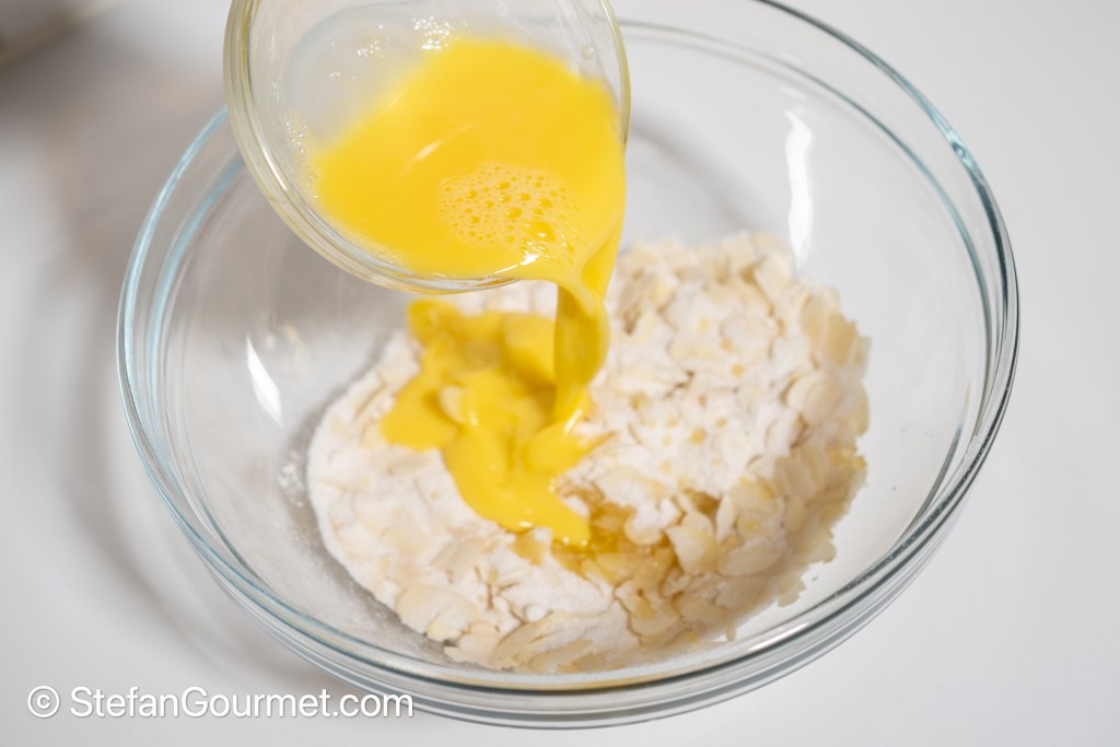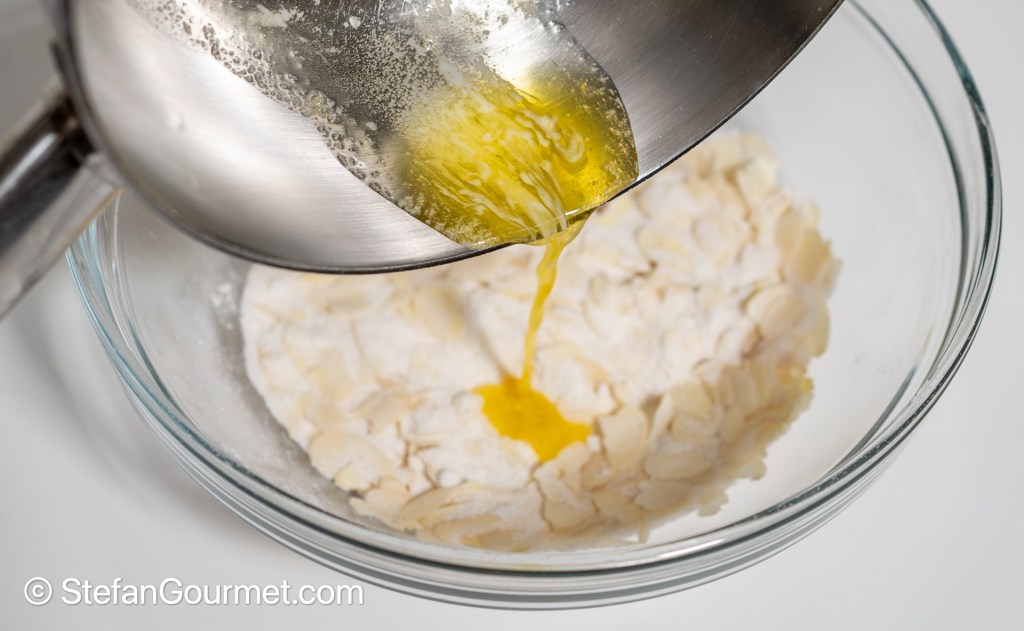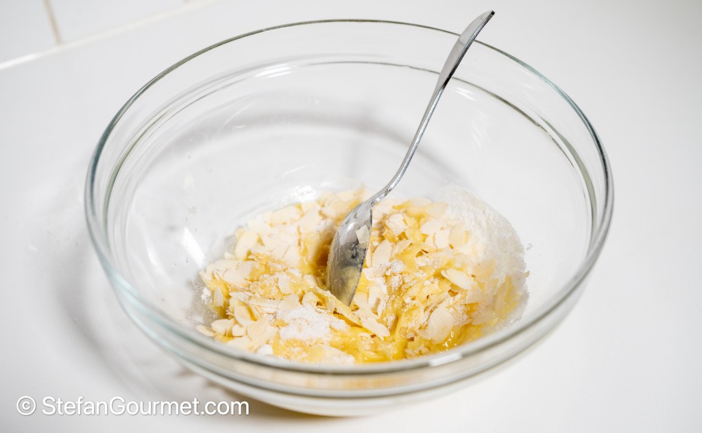 Combine the slivered almonds, sugar, flour, water, and salt in a bowl. Add the melted butter…