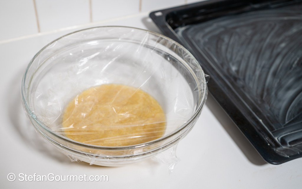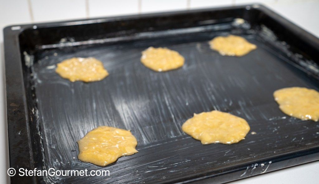 Allow the batter to rest for an hour. Meanwhile, generously butter two (!) baking sheets. The cookies will need to be spaced wide apart, as otherwise you will end up with one giant cookie.