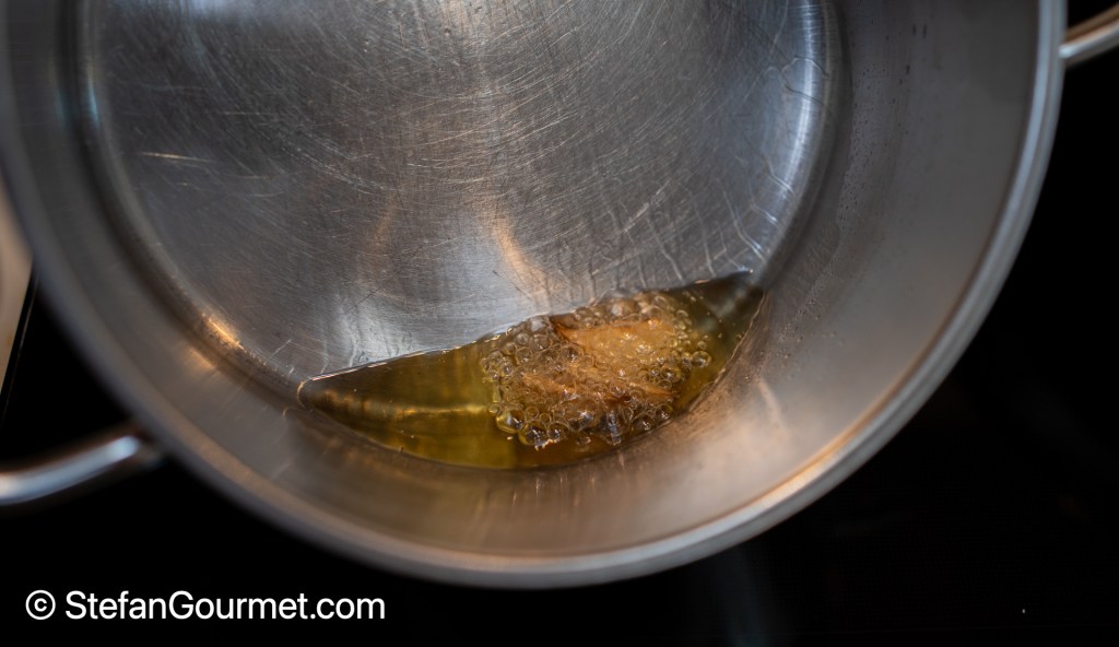 In the meantime, heat 1 tablespoon of olive oil in a pan and add a thickly sliced garlic clove. Tilt the pan and fry the garlic in the oil until it is golden, then discard the garlic. This will infuse the oil with garlic flavor, but you will not be eating the actual garlic.
