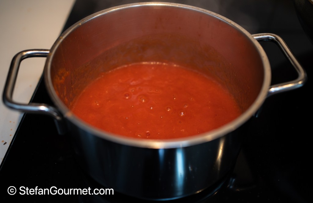 Simmer the tomato sauce over low heat until it is no longer watery, about 20 minutes. You can see in the photo that when you draw a line on the bottom of the pan with a spatula, the sauce is not leaking water. Taste and adjust the seasoning with salt and freshly ground black pepper.