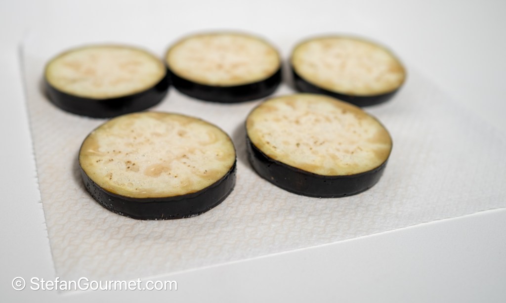 Pat the eggplant dry with a paper towel. (There is no need to rinse the eggplant, unless you used too much salt.)