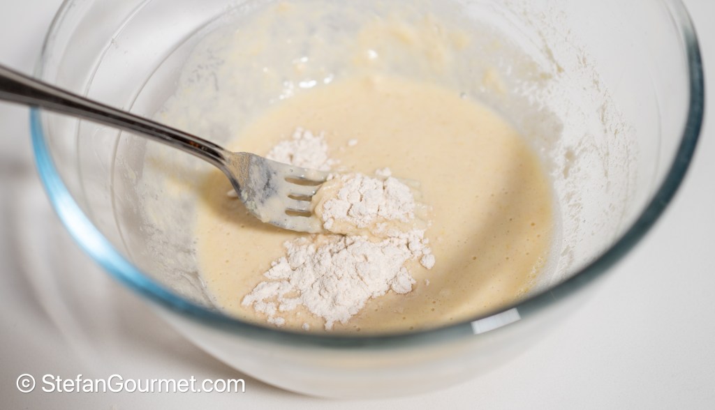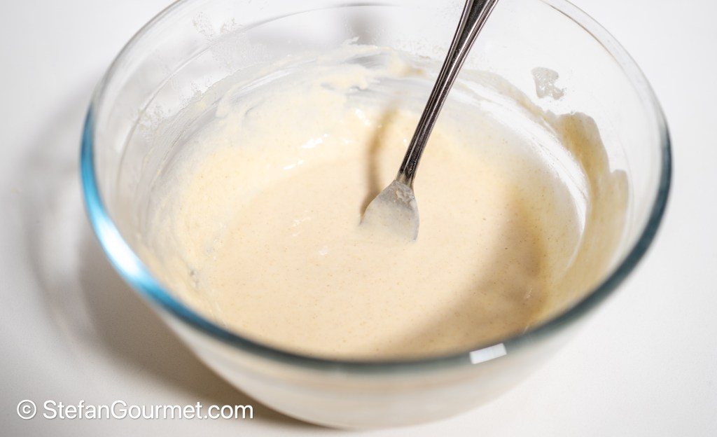 …and stir until there are no more lumps. The batter should have the thickness of pancake batter. If it is too thick, add one or two teaspoons of water.