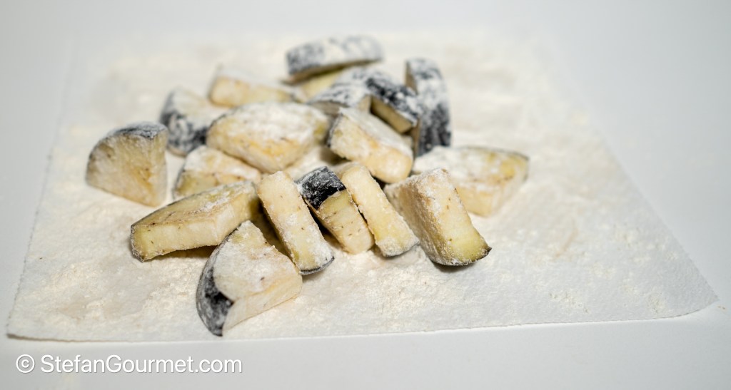 - The batter should be made with (cheap) vodka or sparkling water to get a lot of tiny bubbles from the stronger evaporation of alcohol compared to water (look at the close up photo to notice the bubbles). I used a mixture of half water and half 95% proof alcohol, as I didn’t have vodka in the house. The alcohol will burn off completely, so there won’t be any alcohol left when you eat the eggplant. It also helps to use flour with a low gluten content, such as cake flour.
