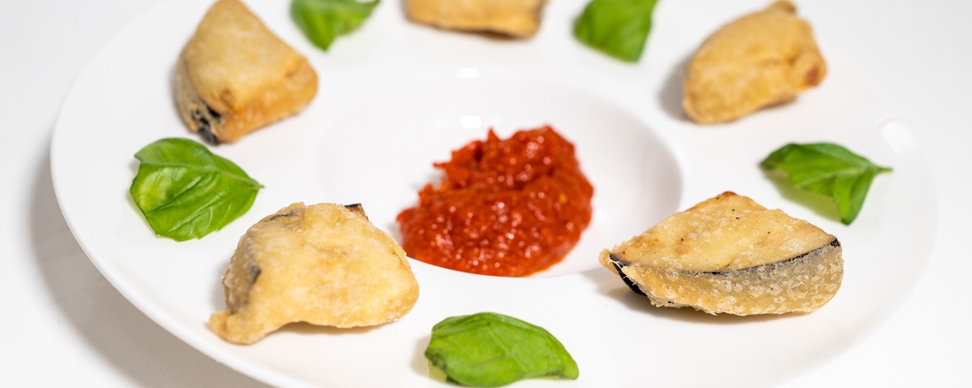 Melanzane fritte in pastella are slices of eggplant/aubergine dipped in batter and then deep fried until crispy on the outside and creamy on the inside. With some basil and tomato dipping sauce this is a lovely appetizer, that could also be served as hors d’oeuvres with cocktails.