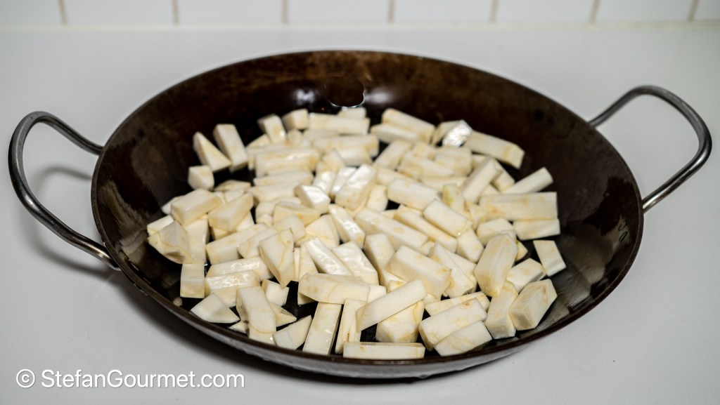 When I was writing the recent post about dishes we have on a regular basis, I noticed that there were a few dishes that I make several times per year, but are not featured on the blog yet. As there are almost 1,300 recipes on this blog that I have published over the last 10 years, it gets hard to keep track of what is and what is not on the blog. One of the ‘missing’ dishes was penne with celeriac (also known as celery root). Oven roasting really brings out the flavor of the celeriac, and it is vegetable that keeps well and is easily available in winter from local sources rather than flown in or grown in a greenhouse. You could add some roughly chopped toasted walnuts for more texture and flavor — they can be roasted along with the celeriac and will take 6 minutes or so.