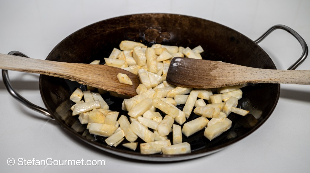 Toast the walnuts, if using, along with the celeriac for about 6 minutes or until crunchy and fragrant (but not burnt).